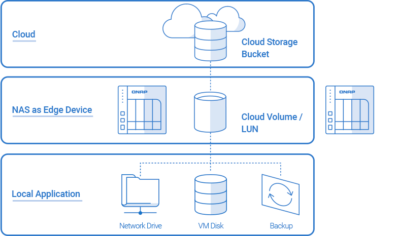 | Deployment method | Connects cloud object storage (Bucket) and back up data from NAS local stored space (Volumes/LUNs) to the cloud | Mount another QNAP NAS storage space as a virtual disk, which can be used to create storage pools and volumes |