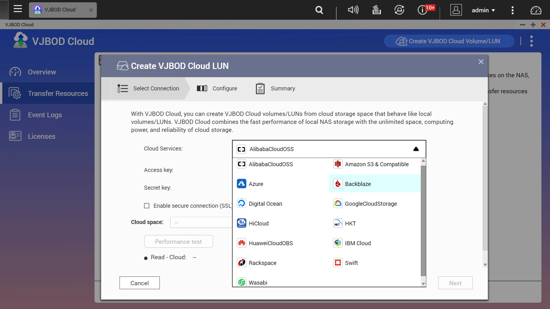 After installing VJBOD Cloud app from the App Center, you can create cloud volumes or cloud LUNs and specify your connection with cloud storage.