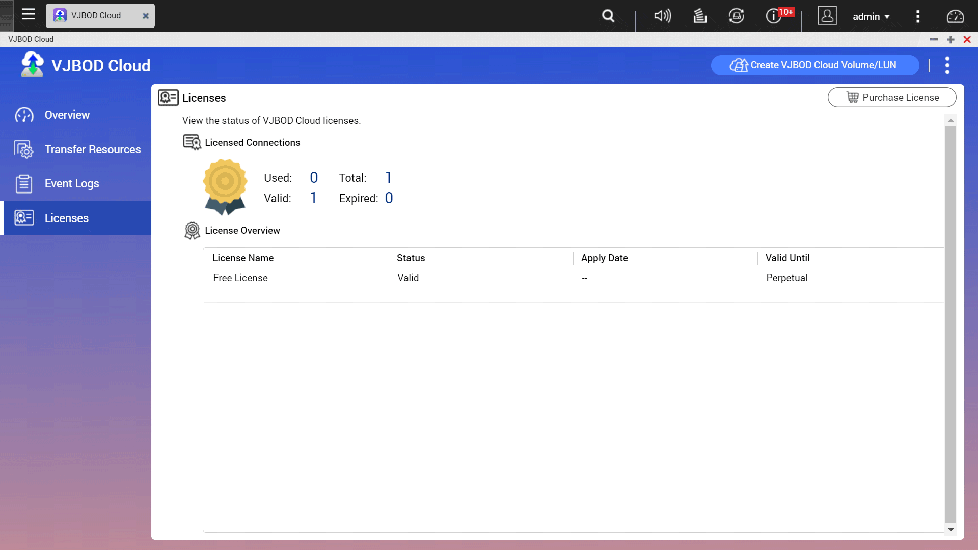 VJBOD Cloud provides one free lifetime license. You can purchase additional licenses (up to 8) and connect up to 9 buckets. A single cloud storage space can accommodate multiple cloud volumes and/or LUNs*.
